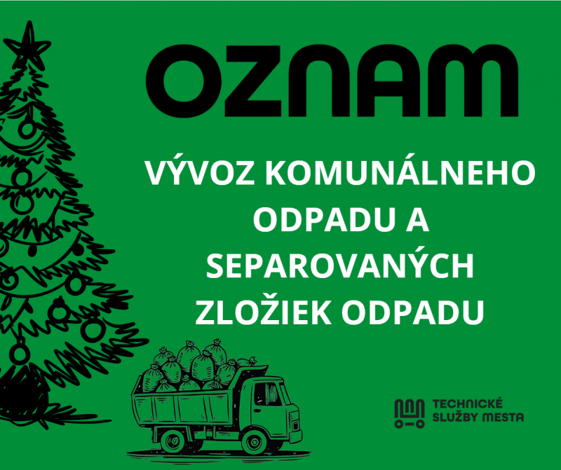 Technické služby mesta oznamujú, že vývoz komunálneho odpadu a separovaných zložiek odpadu sa počas vianočných sviatkov uskutoční podľa rozpisu, a to aj počas dní pracovného pokoja, nasledovne: